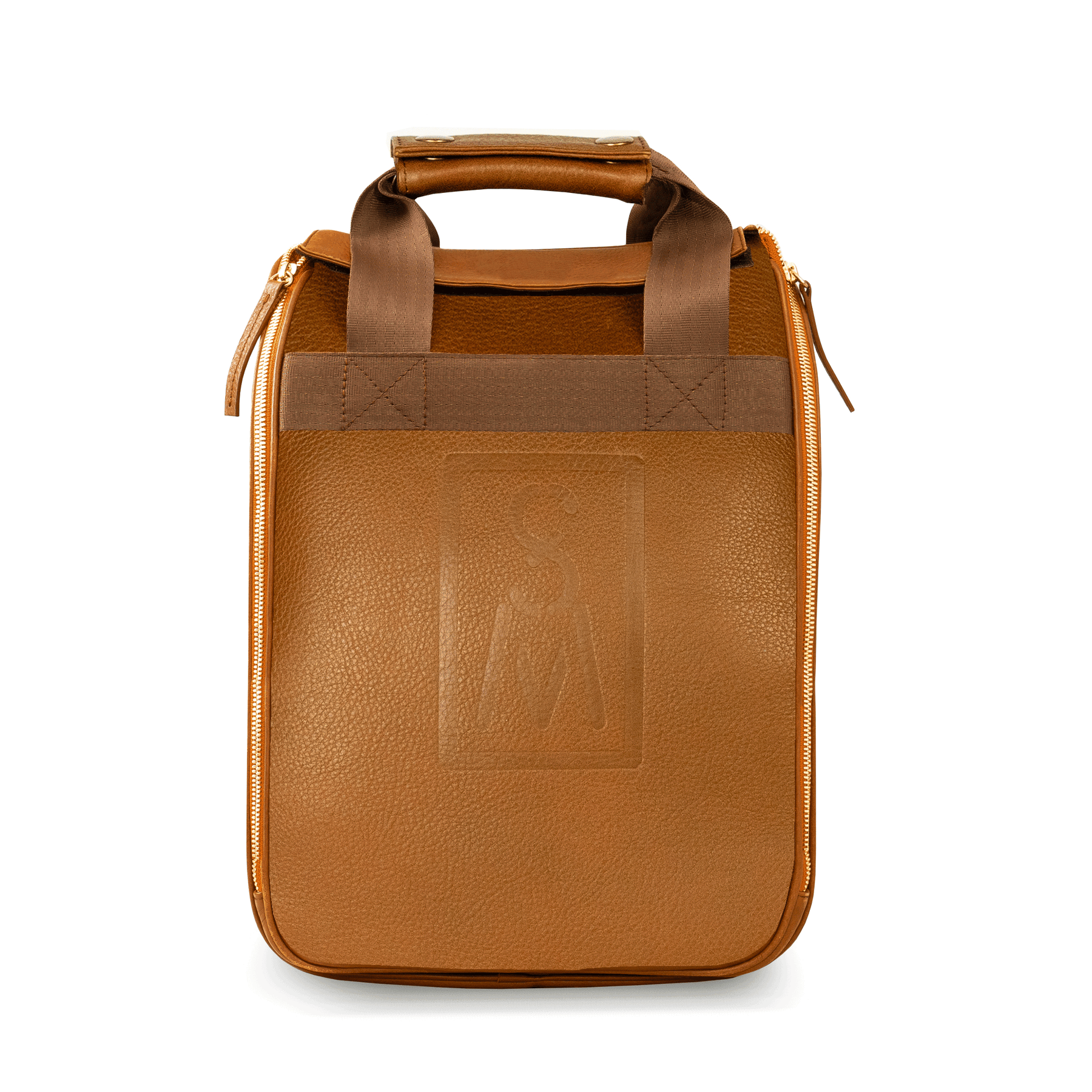 Brown Veg Tan Cow Hide Leather Shoe Bag Featuring SM Monogram Logo On Front, Micro Suede Lining, Zipper Pouch Divider And Exterior Zipper Pocket. Great For Keeping Your Shoes or Cleats In.